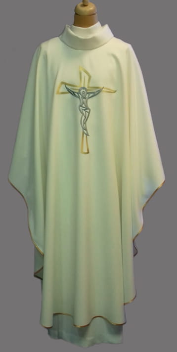 Ornat liturgiczny ze złoto-srebrnym haftem z nowoczesną pasyjką.
