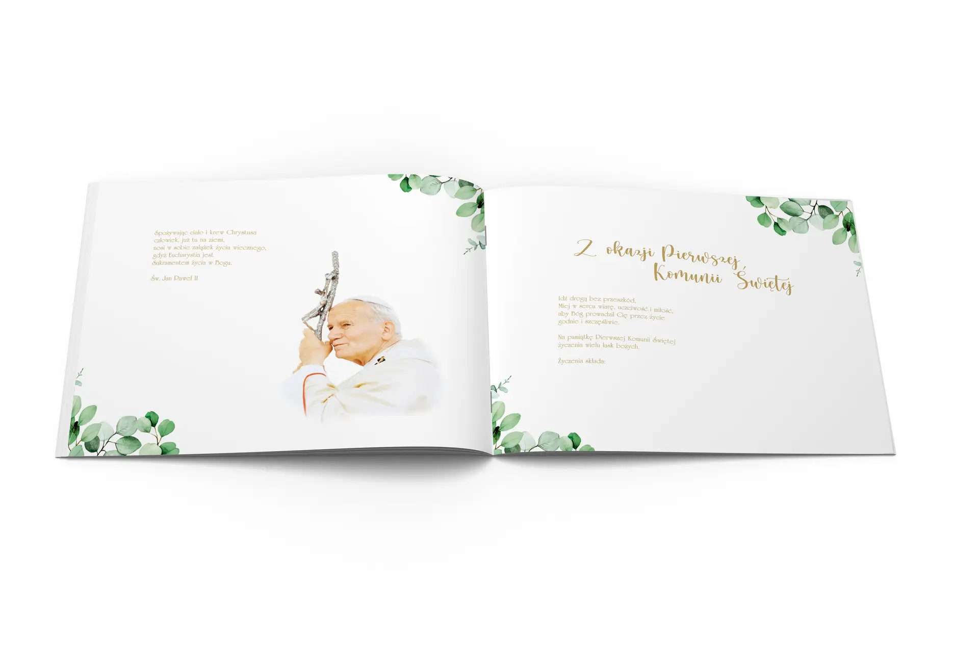 Elegancki album pamiątkowy z okazji I Komunii Świętej to wyjątkowy sposób na zachowanie wspomnień z tego uroczystego dnia. Produkt wzbogacony jest o książeczkę z cytatami Jana Pawła II, fragmentami Biblii i życzeniami, co czyni go nie tylko piękną pamiątką, ale także inspiracją duchową dla dziecka.