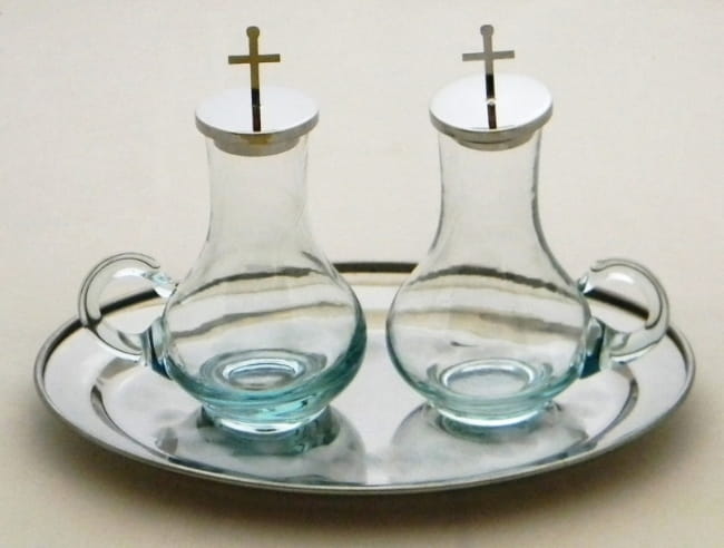 Precyzyjnie wykonane ampułki mszalne z tacką posiadającą uchwyty podtrzymujące.