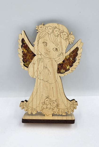 Aniołek wykonany ze sklejki, dodatkowo ozdobiony bursztynem.