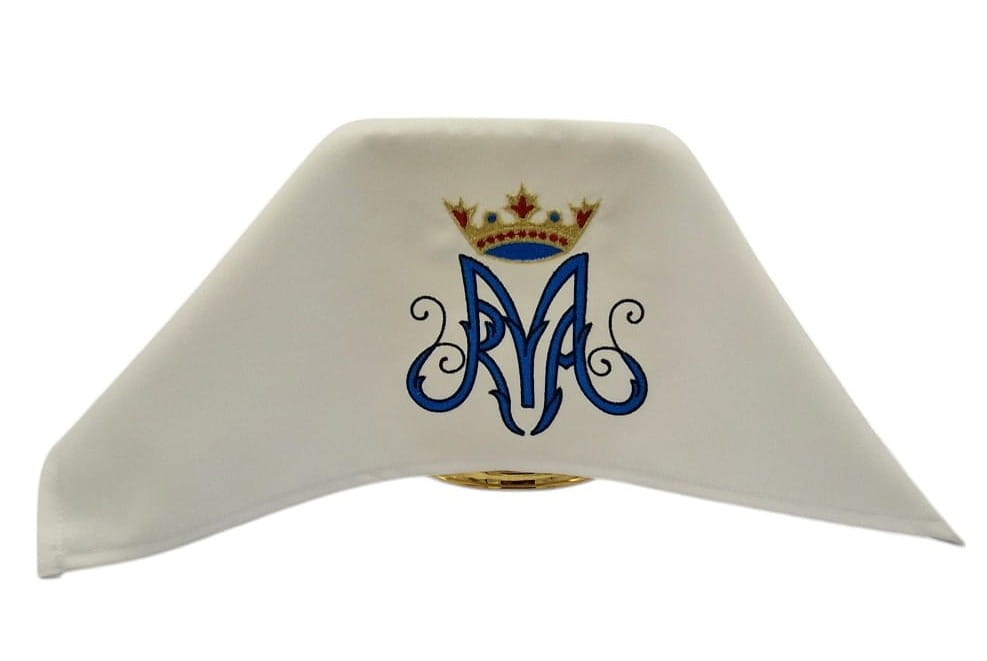 Elegancki biały welon kielichowy z wyraźnym, wysokiej jakości haftem monogramu Maryi (litera "M" z koroną) to doskonały dodatek do godnego sprawowania liturgii.