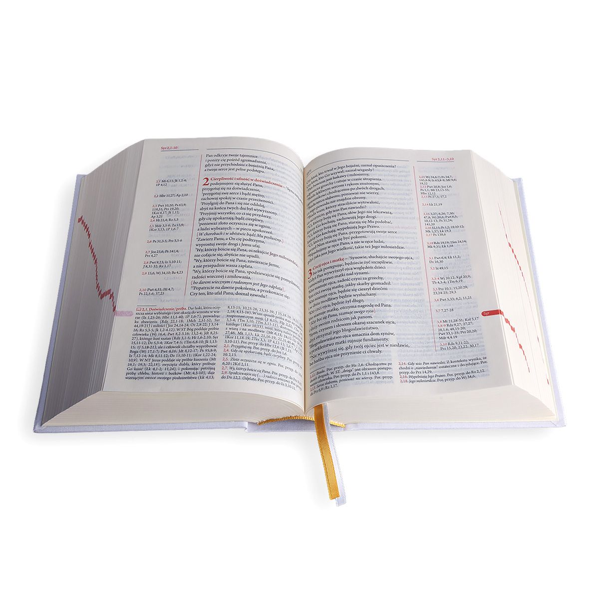Niniejsze wydanie Pisma Świętego wykończono płócienną, białą oprawą. Na naszej stronie znajdziesz również inne warianty okładki: twardą turkusową oraz płócienną czerwoną – każda w wersji z paginacją i bez niej.