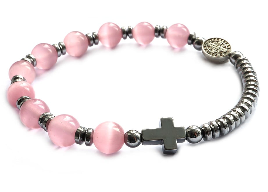 Bransoletka dziesiątka różańca na rękę - kocie oko różowe