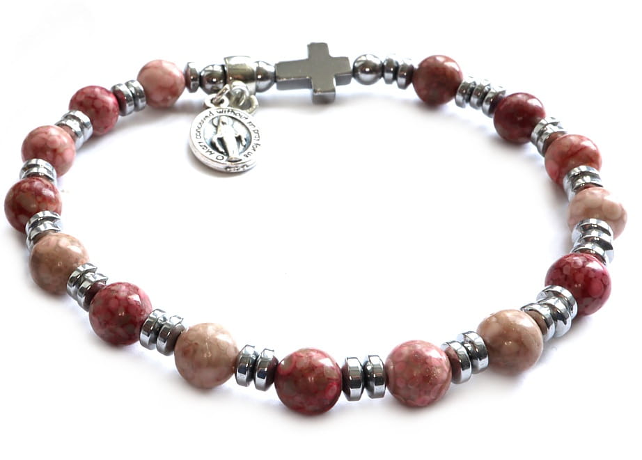 Różaniec nawleczony jest na wytrzymałą silikonową gumkę, dzięki czemu wygodnie się go nosi i dopasowuje się do nadgarstka. Możesz go nosić jako bransoletkę na rękę lub dziesiątkę, co ułatwia modlitwę w każdej chwili.