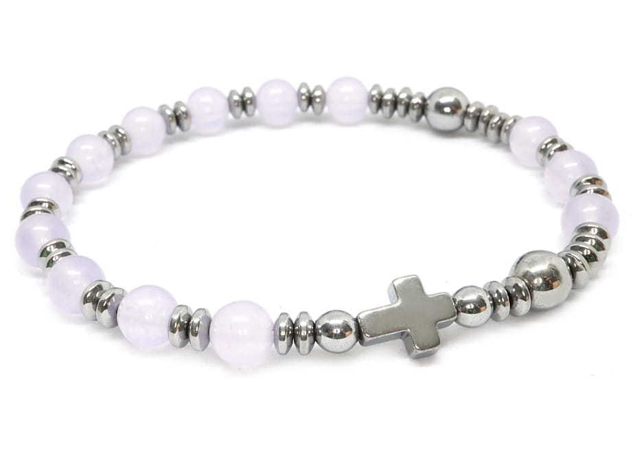 Pastelowo różowy różaniec na rękę. Wykonany z 6mm kamieni jadeitów różowych i srebrnego hematytu.