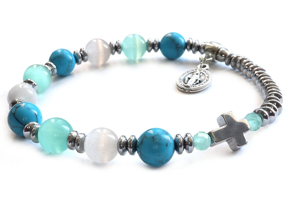 Elegancka bransoletka-różaniec wykonana z naturalnych kamieni: turkusu, kociego oka i srebrnego hematytu. Połączenie tych trzech kamieni tworzy wyjątkową kompozycję, która nie tylko pięknie wygląda, ale także ma głębokie znaczenie symboliczne. Bransoletka została wykonana na mocnej, silikonowej gumce, dzięki czemu idealnie dopasuje się do nadgarstka. Dodatkowo, bransoletka została ozdobiona zawieszką w kształcie Cudownego Medalika.