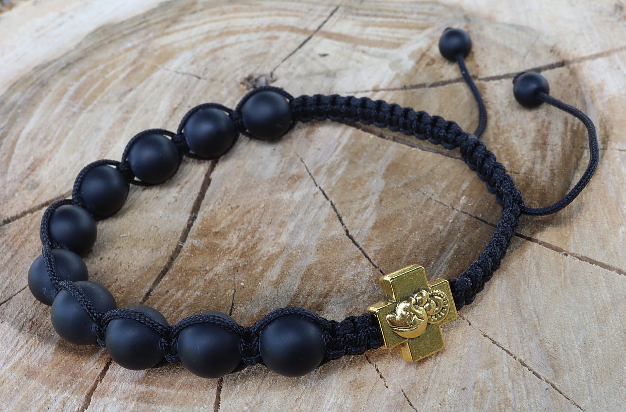 Bransoletka różaniec na rękę pleciony - onyks złoty krzyż