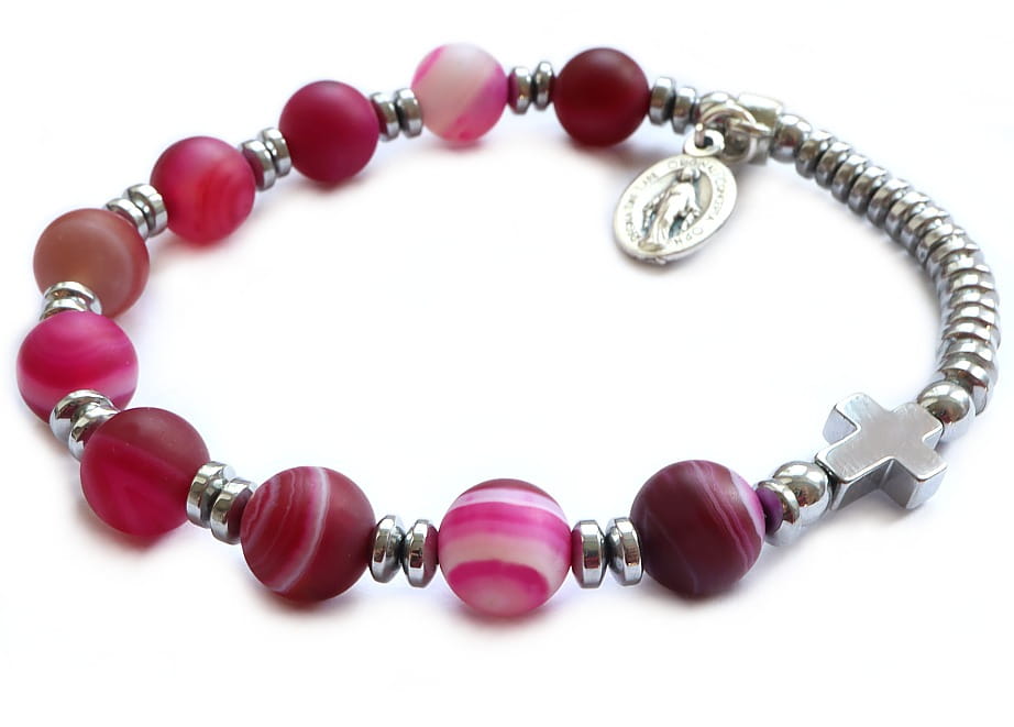 RÓŻANIEC - BRANSOLETKA NA RĘKĘ - DZIESIĄTKA Z KAMIENI AGATÓW MATOWYCH W KOLORZE FUKSJI.