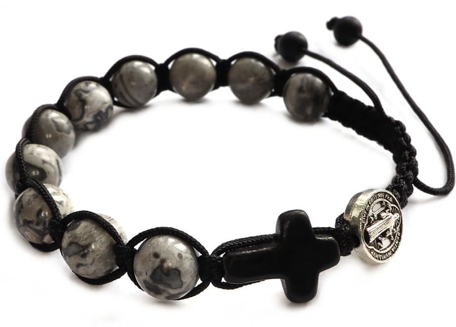 Bransoletka różaniec pleciony jaspis +Św. Benedykt