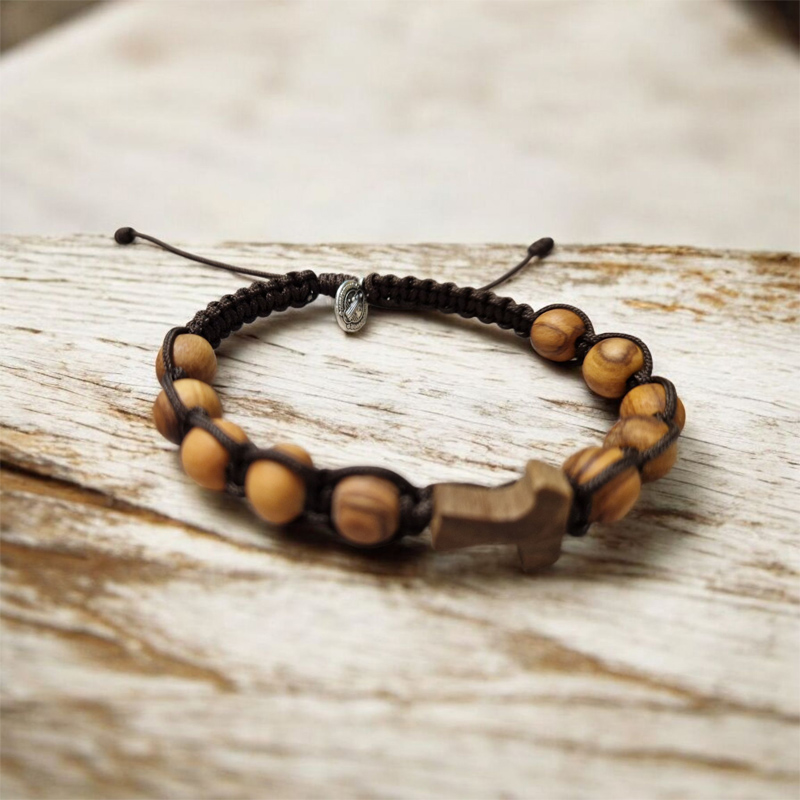 Bransoletka różańcowa z drewna oliwnego z Krzyżem Tau oraz Medalikiem św. Benedykta. Precyzyjnie wykonana bransoletka na sznurkach .