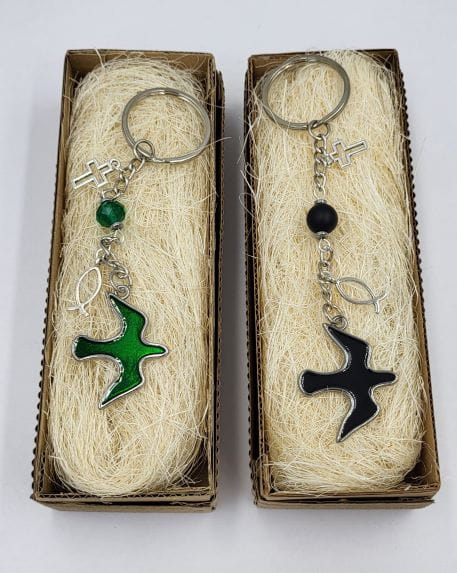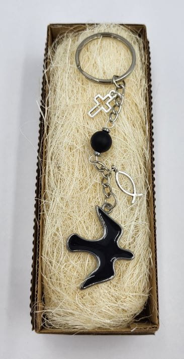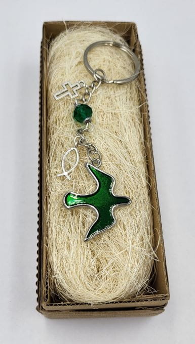 Zawieszka z Duchem Świętym, z kryształkiem, krzyżykiem i rybką - znakiem chrześcijaństwa.