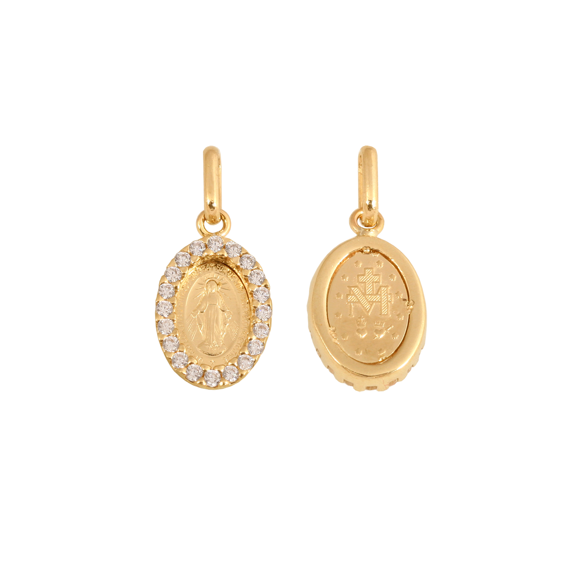 Cudowny medalik ze złota zdobiony cyrkoniami; dwustronny. Matka Boża Niepokalana.