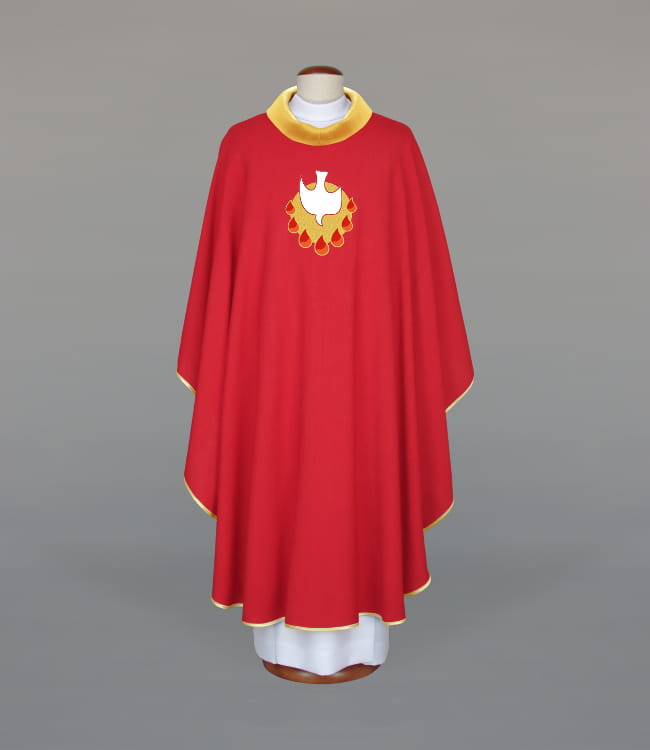 Kołnierz typu golf, w kolorze starego złota. Ornat wykonany z lekkiej, przewiewnej tkaniny. Stuła wewnętrzna w komplecie.