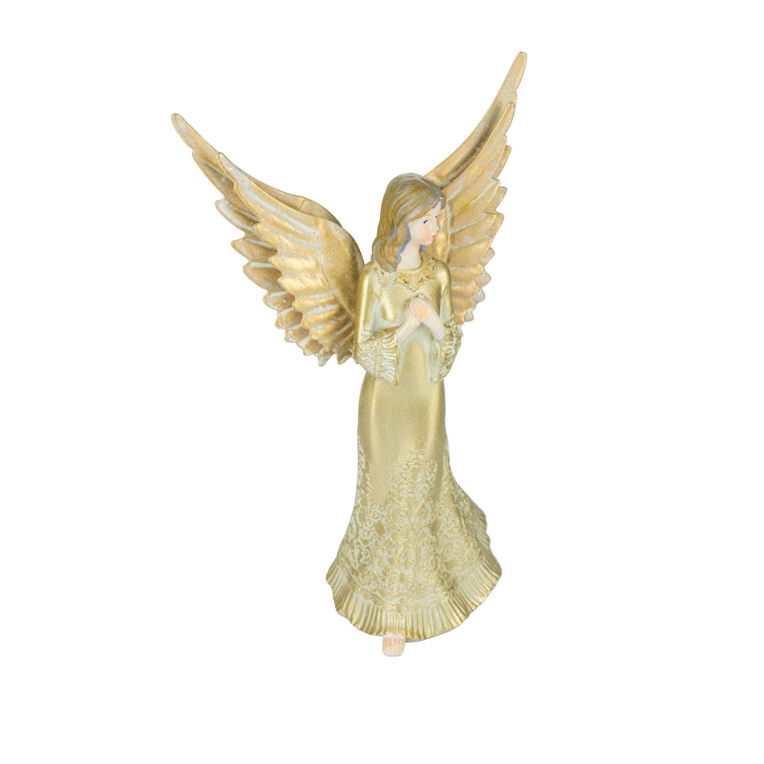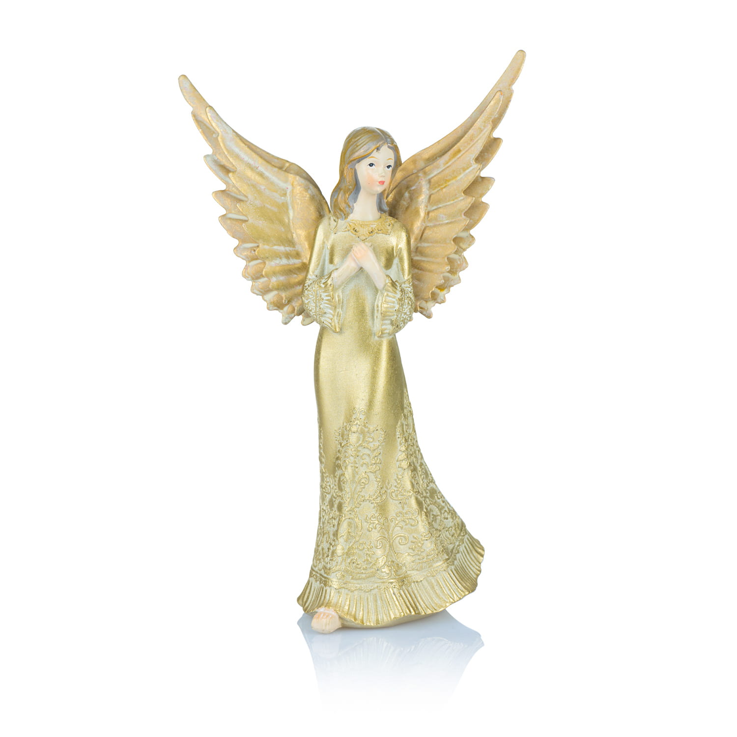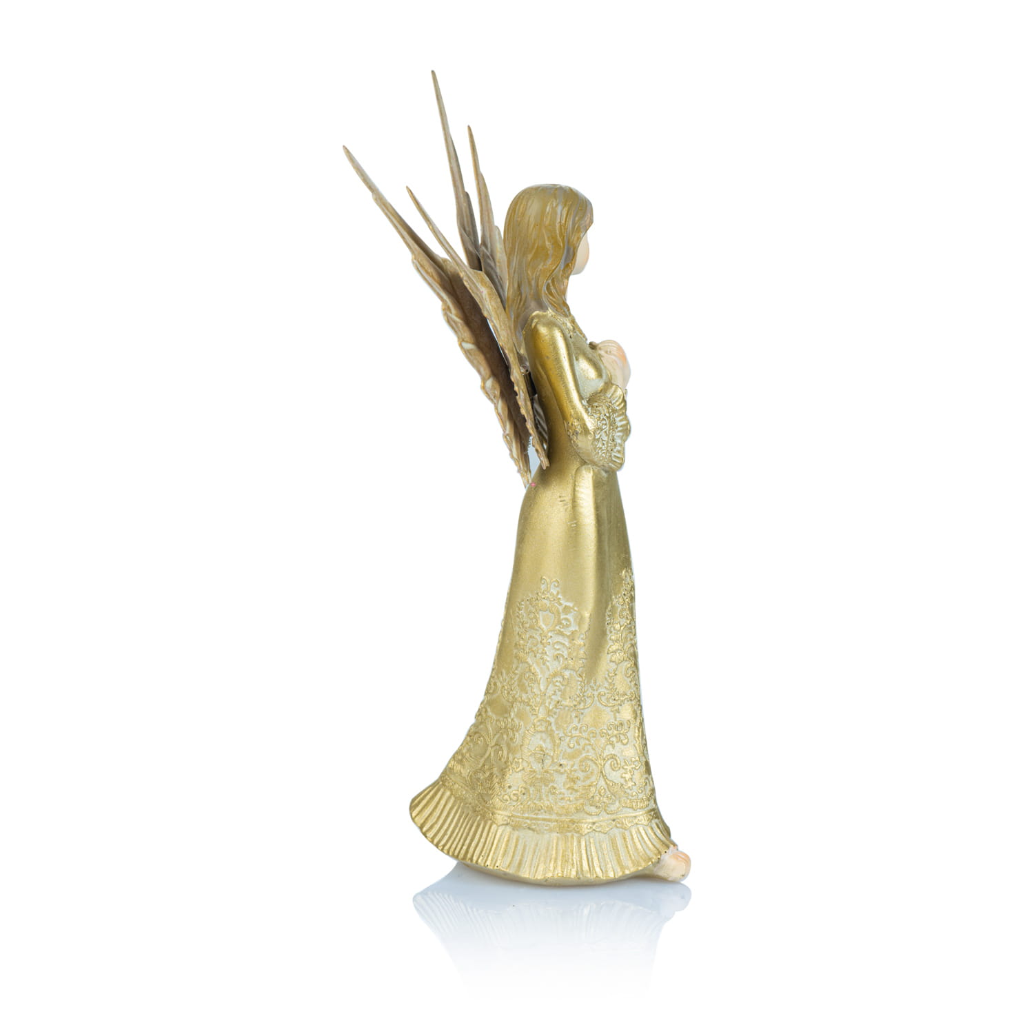 Precyzyjnie i trwale wykonana postać anioła w złotej kolorystyce.
