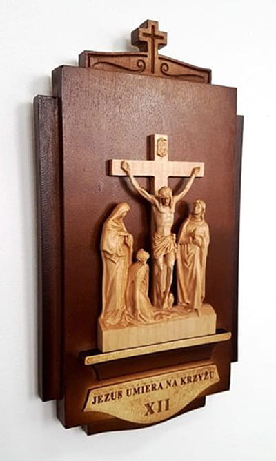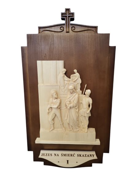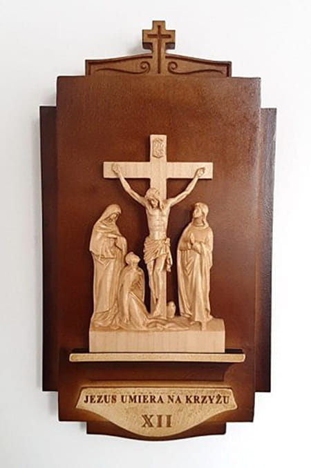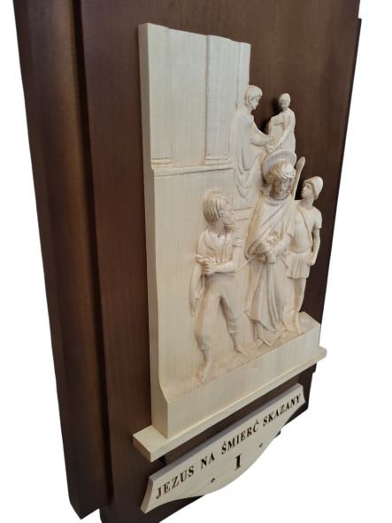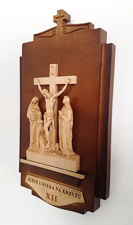 Płaskorzeźby precyzyjnie wykonane w drewnie, do zawieszenia, cena za komplet 14 stacji.