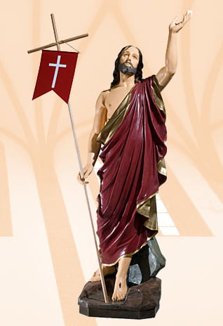 Figura Jezusa Zmartwychwstałego z chorągiewką została wykonana z z syntetycznych żywic o wysokiej trwałości. Figura poddana precyzyjnej obróbce ręcznej, wykończona przy użyciu wysokiej jakości, nowoczesnych farb. Dostępny w kolorze naturalnym (222K) lub ecru (222E).