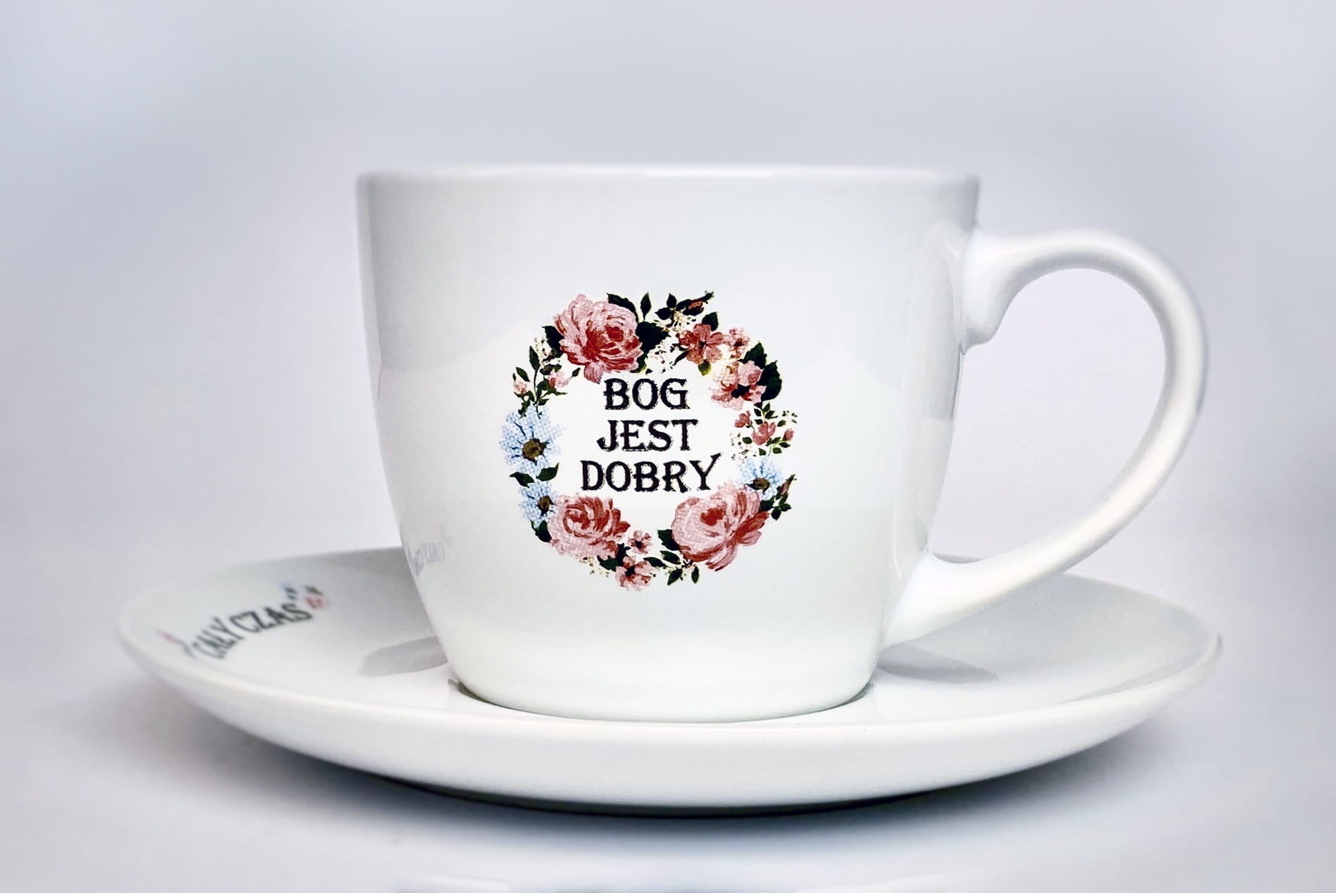 Trwały nadruk na filiżance "Bóg jest dobry" i na spodku "... cały czas". Dodatkowo motywy kwiatowe.