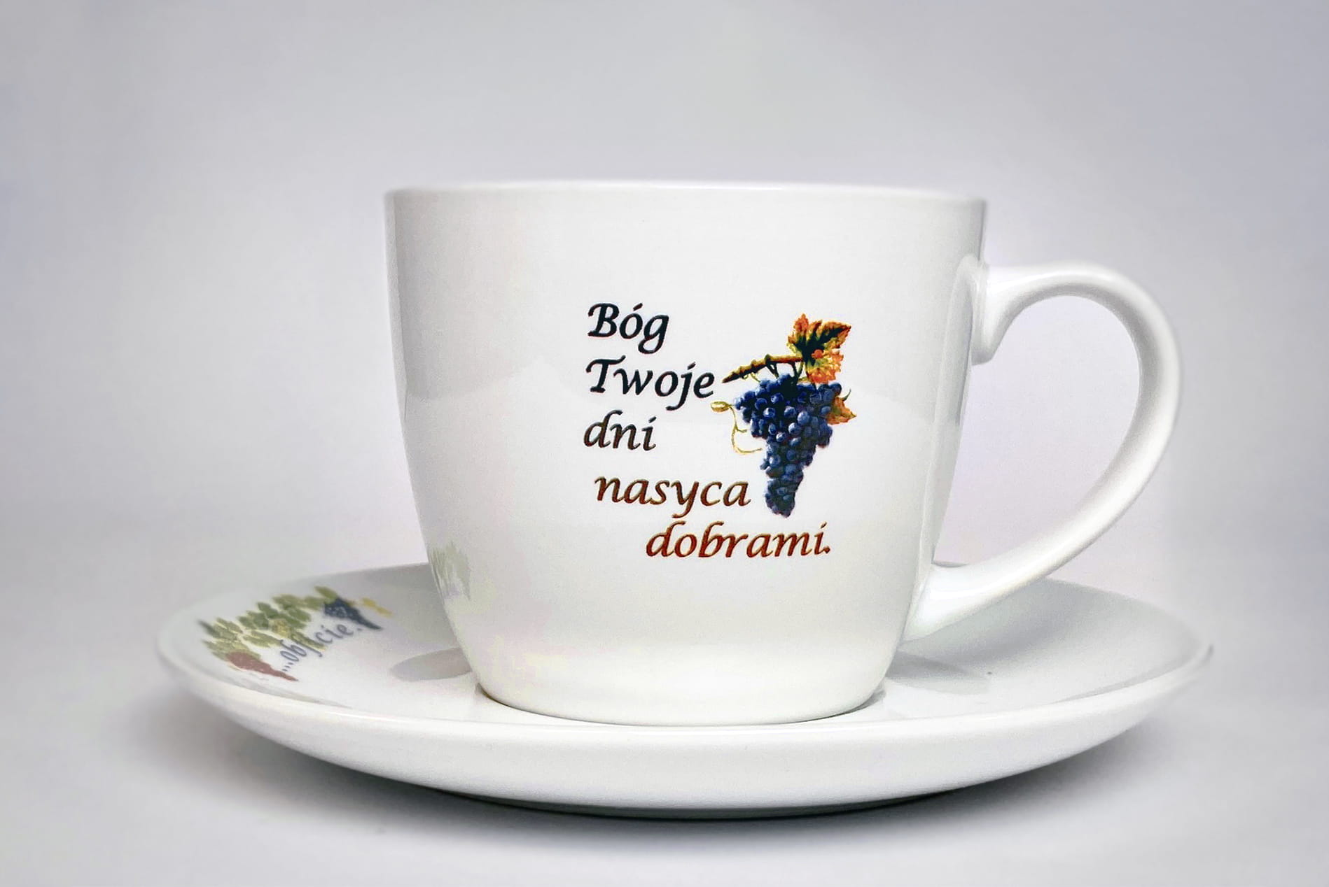 Trwały nadruk na filiżance "Bóg Twoje dni nasyca dobrami" i na spodku "... obficie". Dodatkowo motywy winorośli.