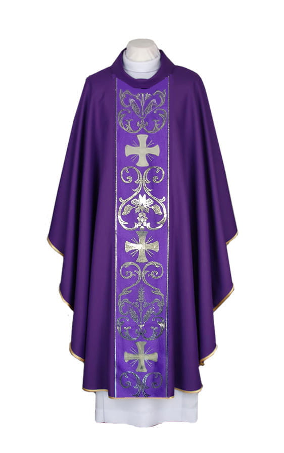 Fioletowy ornat liturgiczny z naszywanym dwustronnie tkanym pasem reksorowym.
