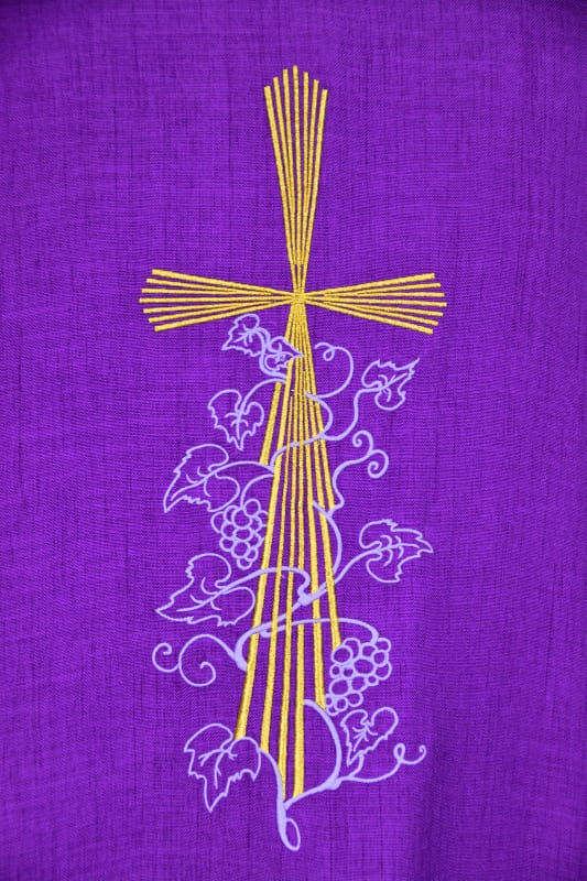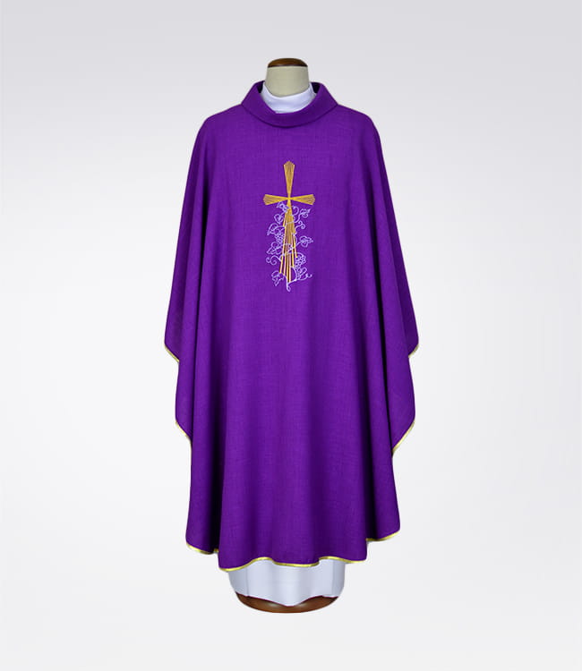 Ornat zdobiony haftem, wykończony złotą, brokatową lamówką.