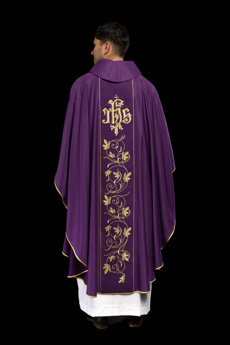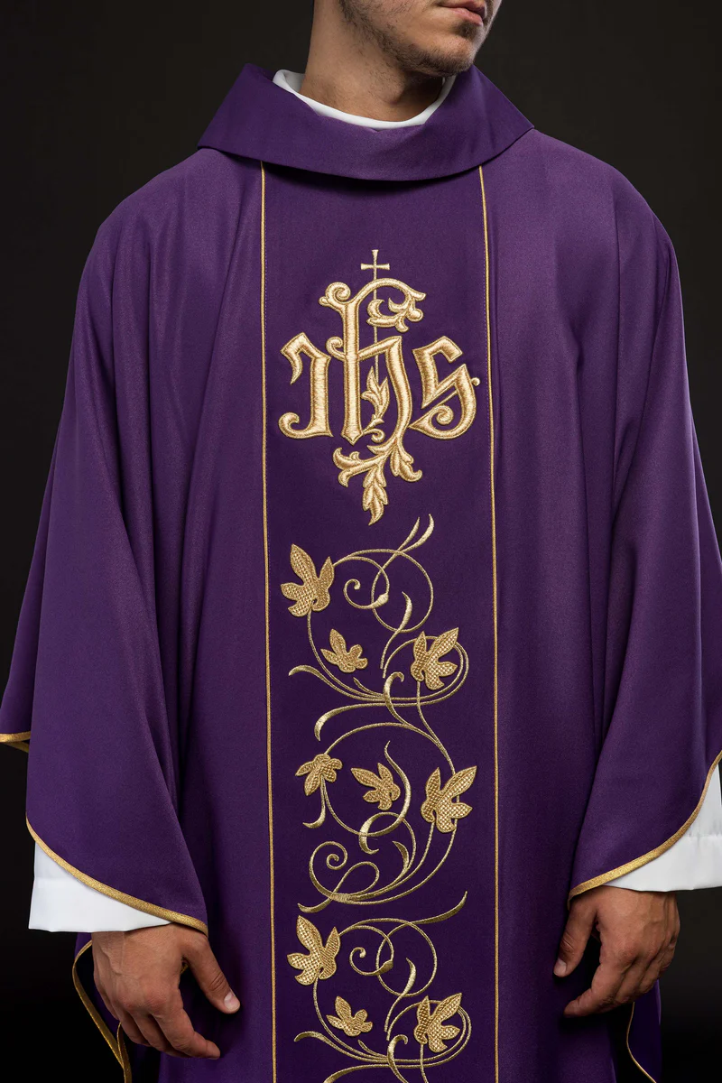 Bogato zdobiony pas z motywem florystycznym i symbolem IHS stanowi wyjątkowy element zdobniczy.