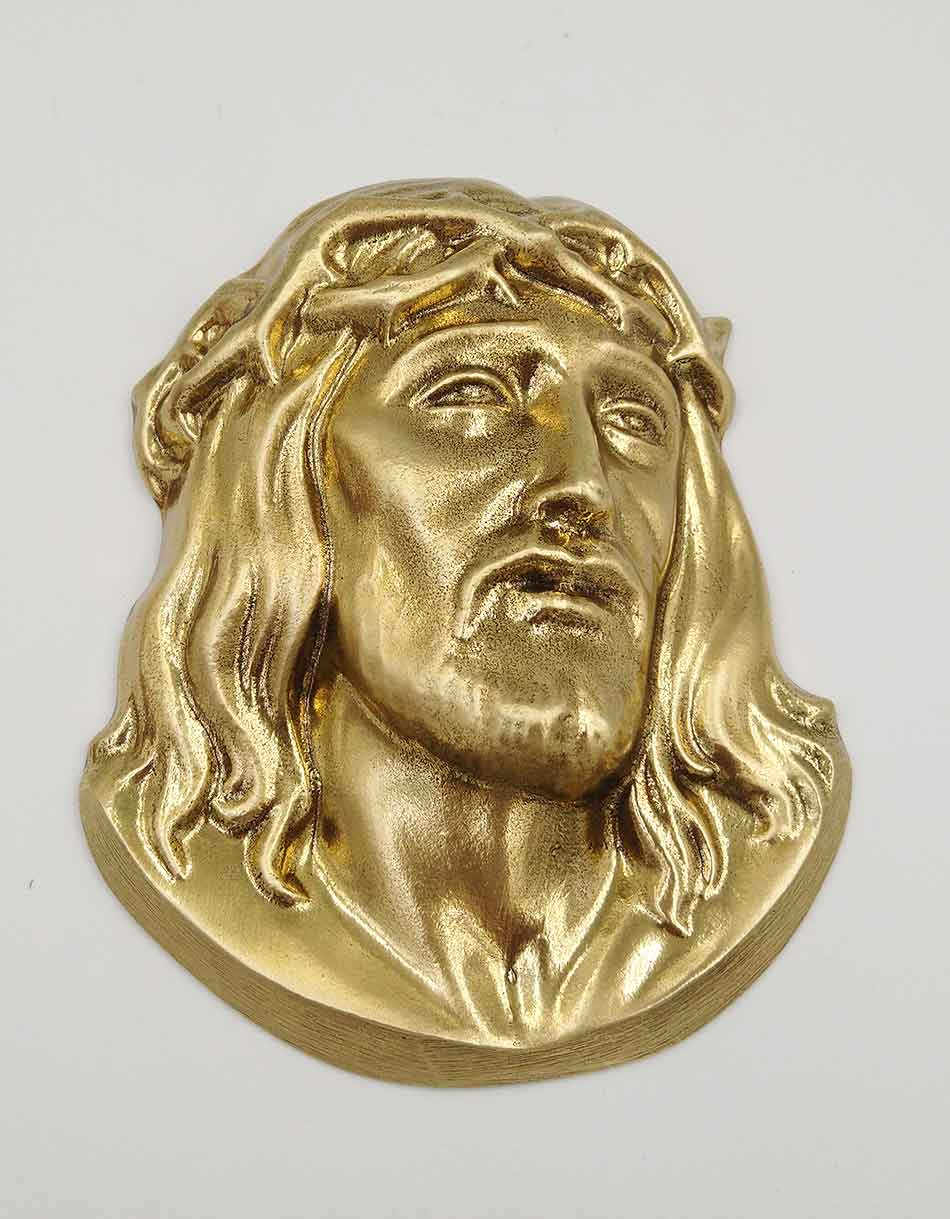 Głowa Chrystusa wykonana ze stopu cynku, pokryta powłoką galwaniczną i zabezpieczona lakierem bezbarwnym.