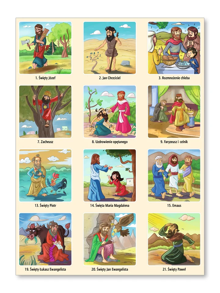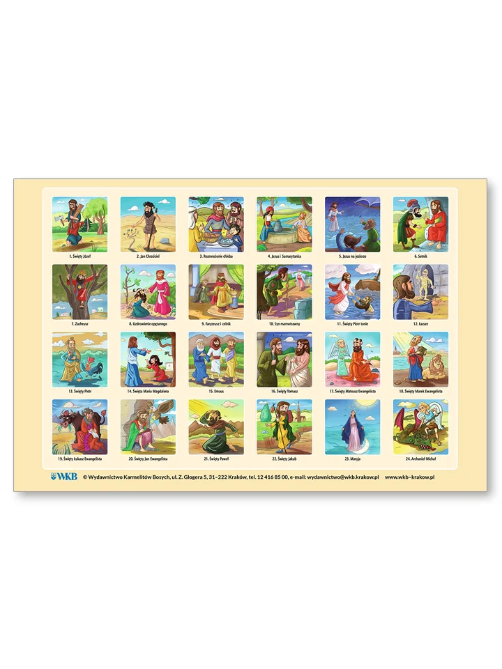 Pudełko z grą zawiera 24 pary kartoników z postaciami z Nowego Testamentu oraz instrukcję.