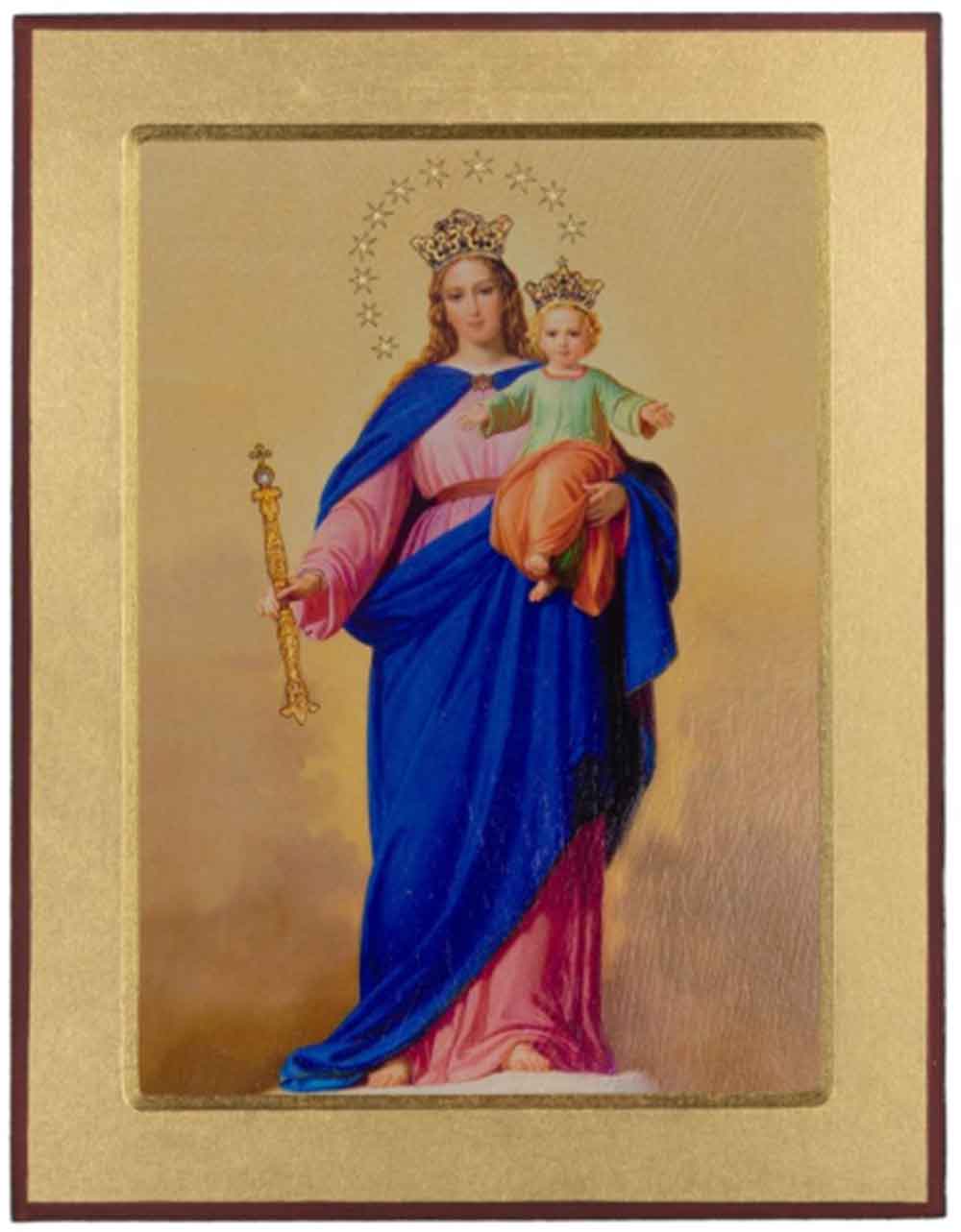 Ikona wykonana w ekskluzywnej technice bezpośredniego przenoszenia farb na deskę. Nadruk bezpośrednio na deseczce oraz wystający kowczeg (aureola) dookoła, z tyłu znajduje się certyfikat. Technika artystyczna, nadruk starzony. Ikona zapakowana jest w pudełeczko.