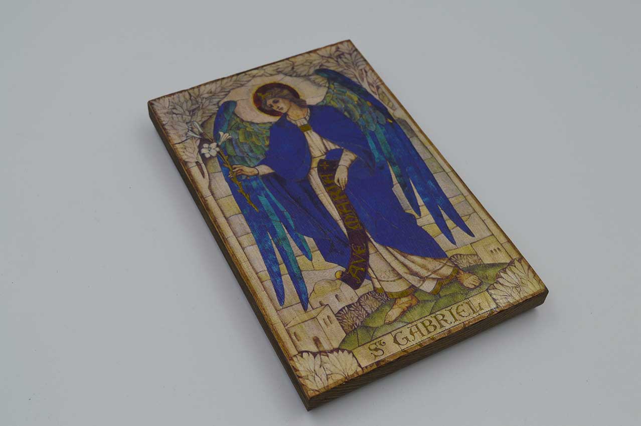 Wysokiej jakości produkt polski. Ikona wykonana techniką decoupage odwzorowująca w pełni wizerunek świętego.