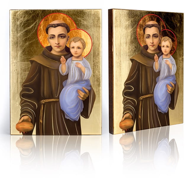 Ikona przedstawiająca Św. Antoniego z Padwy. Przepiękna, ręcznie robiona, kolorowa, wykonana na desce olchowej, ręcznie złocona złotem płatkowym. Ikona wykonana jest unikalną technologią nanoszenia obrazu na drewno. Ikona ta przystosowana jest zarówno do powieszenia jak i do stojącej ekspozycji. Każda nasza ikona posiada złocony certyfikat potwierdzający jej autentyczność.