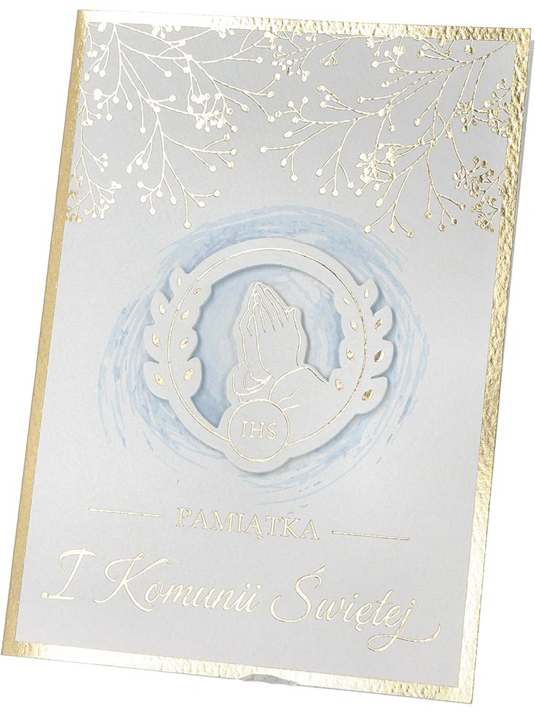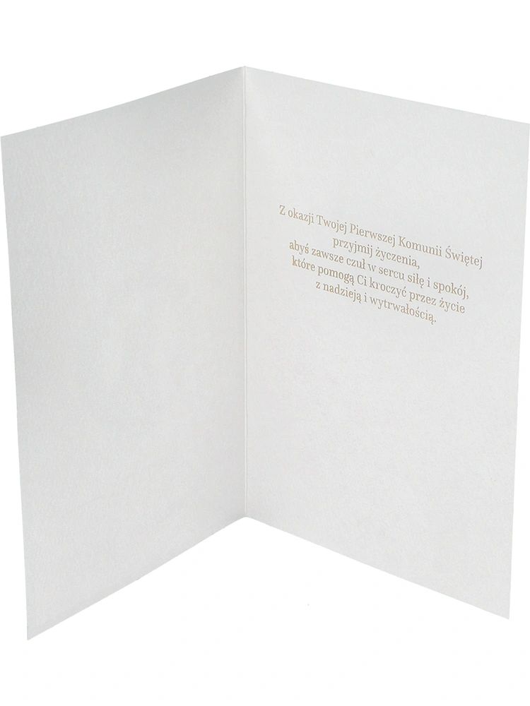 Stylowy karnet z eleganckimi, wyzłacanymi życzeniami, idealny jako pamiątka Pierwszej Komunii Świętej.