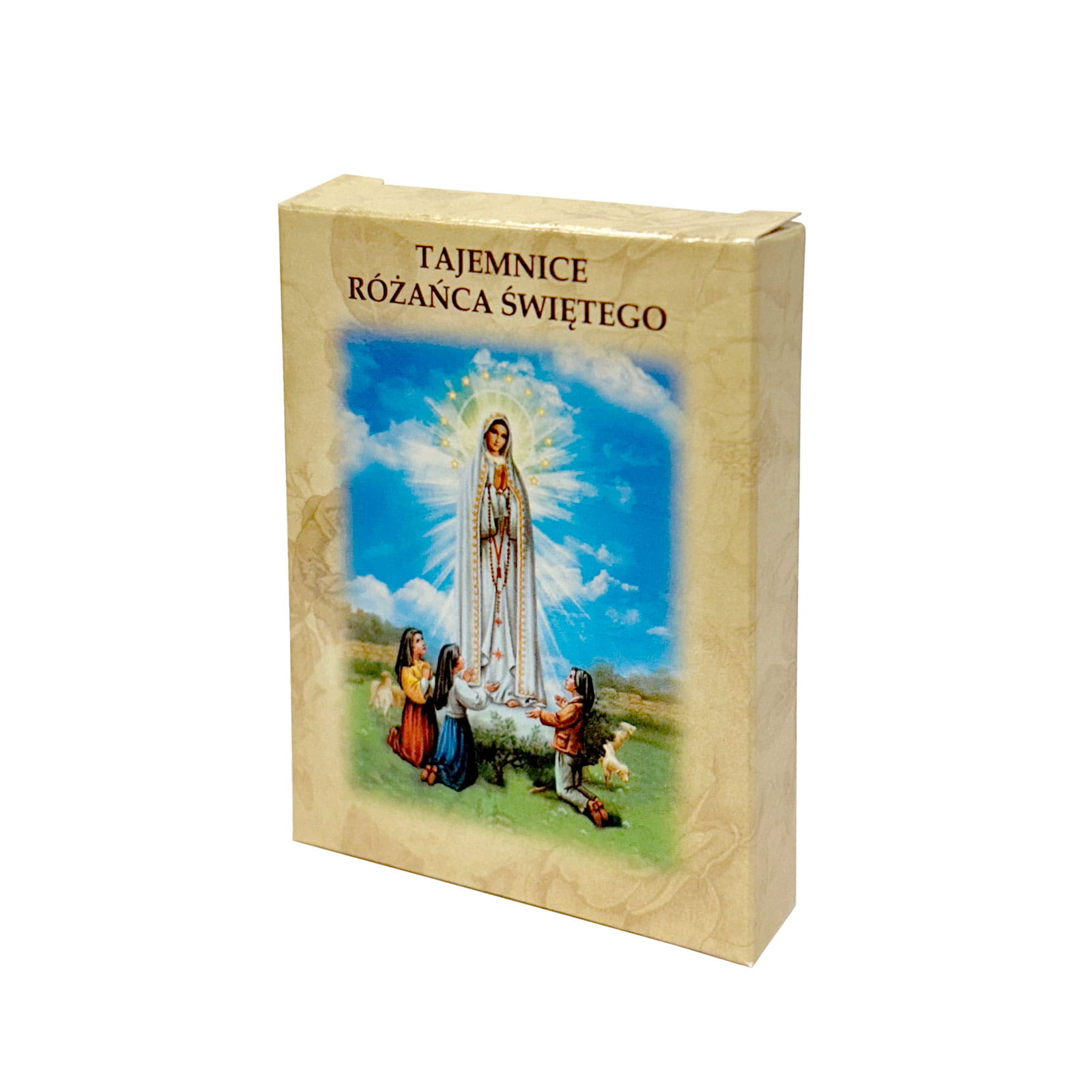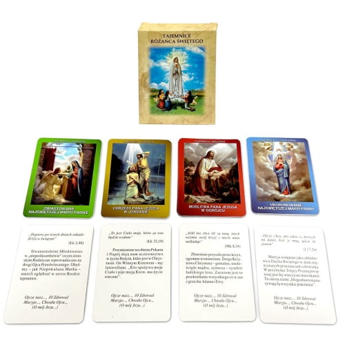 Karty zawierające obrazki dotyczące Tajemnic Różańca Świętego. Na kartach znajdują się cytaty z Nowego Testamentu oraz modlitwy odmawiane przy kolejnych Tajemnicach Różańca Świętego. W opakowaniu jest łącznie 20 kart.