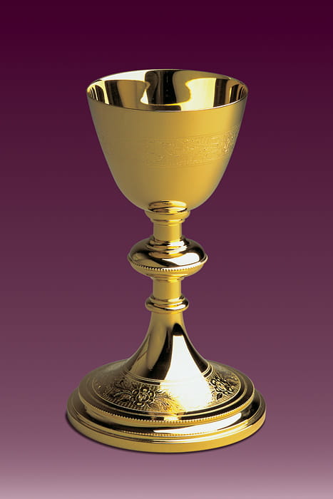 Kielich liturgiczny zdobiony grawerunkiem, złocony 24 karatowym złotem.