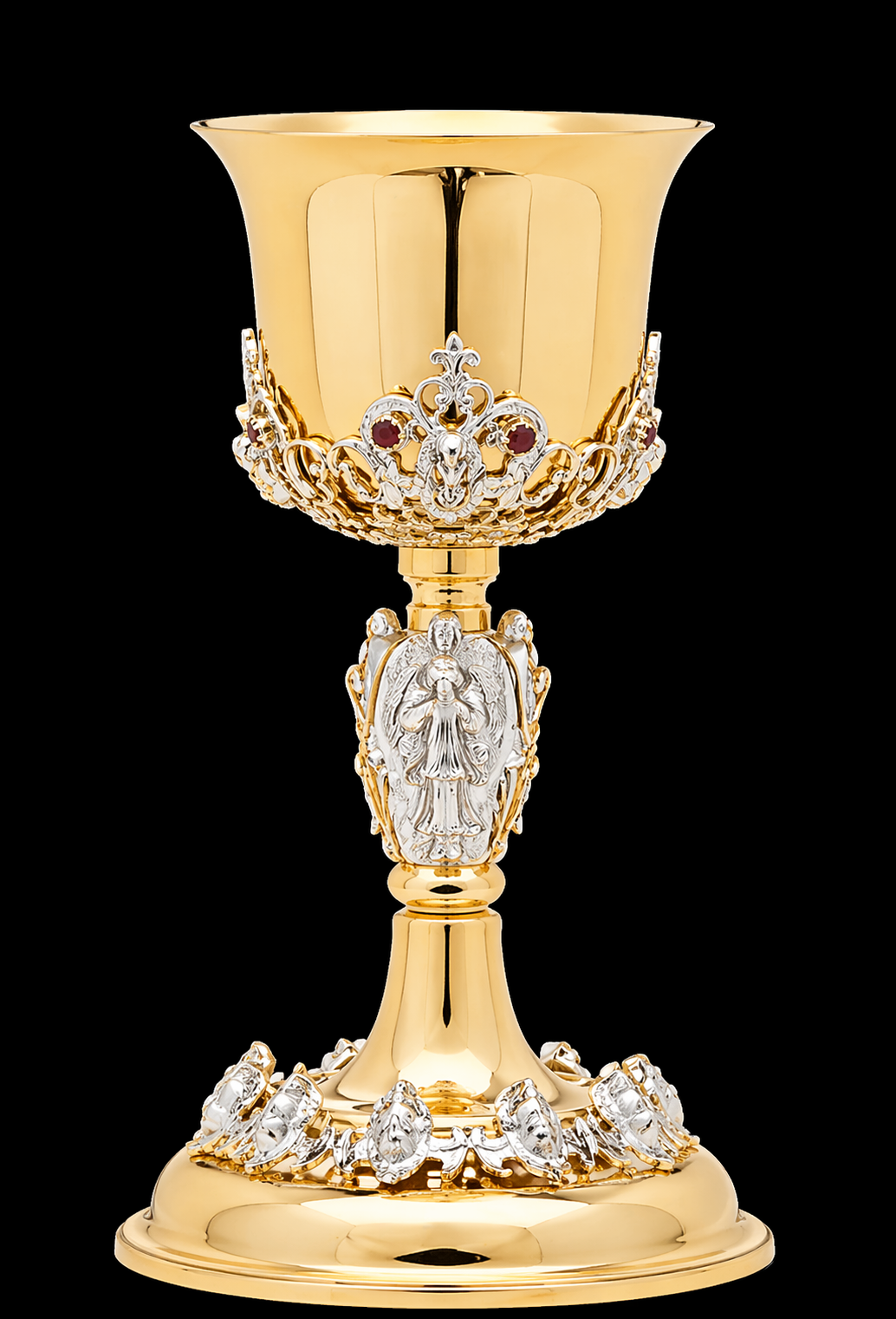 Czasza kielicha została wykończona srebrzoną koszulką, która dodatkowo zdobiona jest efektownymi rubinami, podkreślającymi jego sakralny charakter oraz wyjątkowy wygląd. Nodus oraz ozdobne postacie aniołów umieszczone na podstawie również zostały srebrzone, co tworzy harmonijny kontrast ze złoconą powierzchnią.