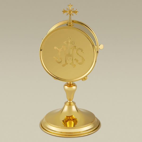 Klasyczne kustiodium mosiężne, złocone 24 karatowym złotem. Grawerunek IHS. Posiada regulowane mocowanie melchizedeka, dzięki któremu możliwe jest zamontowanie większości zabytkowych i współczesnych melchizedeków