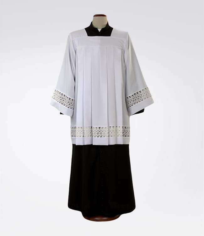 Komża kapłańska w kolorze białym zdobiona bawełnianą wstawką.