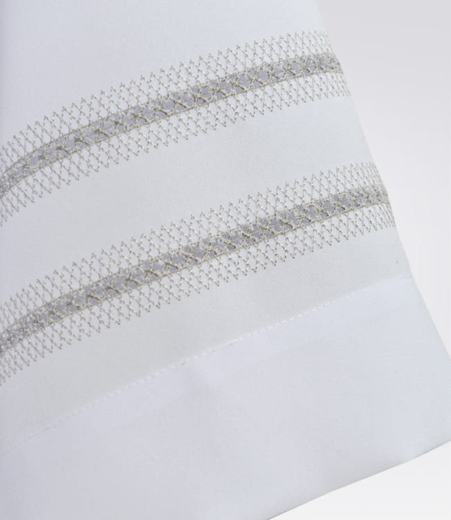 Biała komża zdobiona maszynową, popielatą mereżką. Wykonana z poliestrowej tkaniny.