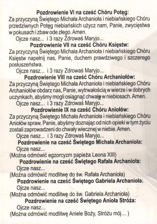 Koronka do św. Michała Archanioła jest nabożeństwem bardzo dawno praktykowanym. Składa się z dziewięciu pozdrowień, a każde z nich z jednego Ojcze nasz, trzech Zdrowaś i westchnienia potem odmawia się cztery Ojcze nasz i modlitwy końcowe. Według, dawnej tradycji to nabożeństwo jest nadzwyczaj przyjemne św. Michałowi Archaniołowi, który w nagrodę za nie przybywa z natychmiastową i skuteczną pomocą we wszelkich potrzebach, a zwłaszcza Kościoła katolickiego, którego jest nieustannym Opiekunem.