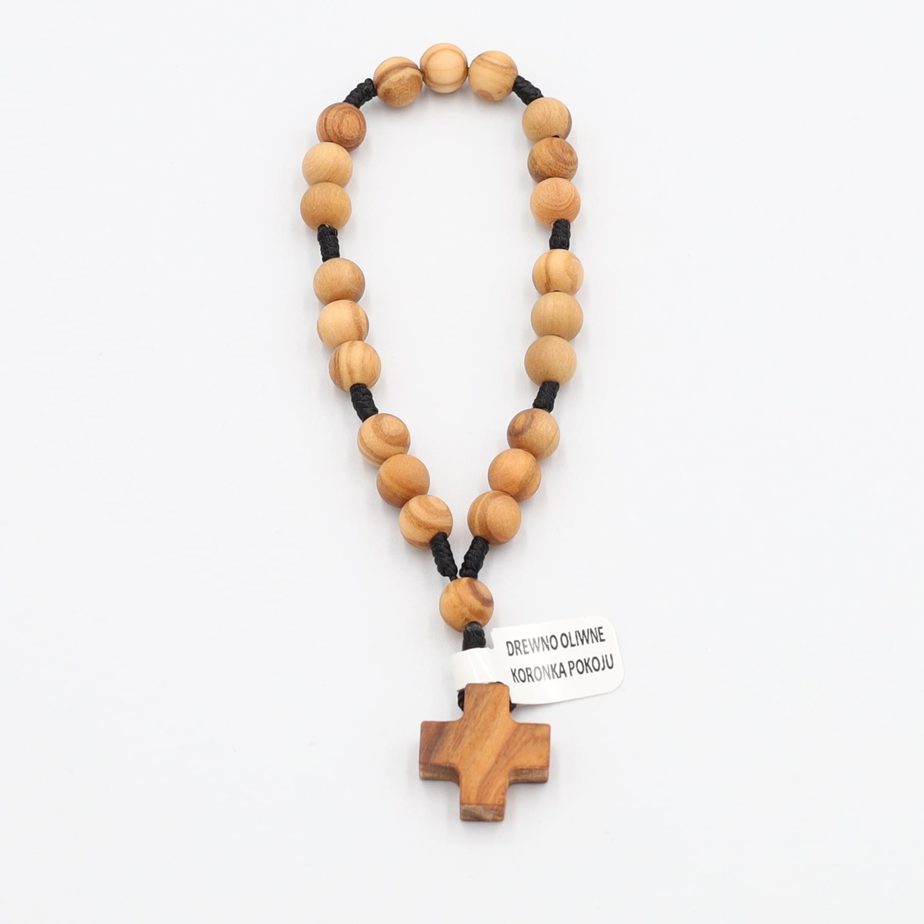 Całość dopełnia krzyż z drewna oliwnego, prosty i pełen symboliki, który podkreśla modlitewny charakter koronki. Niewielki rozmiar sprawia, że jest praktyczna i wygodna do noszenia przy sobie – w kieszeni, torbie czy samochodzie.