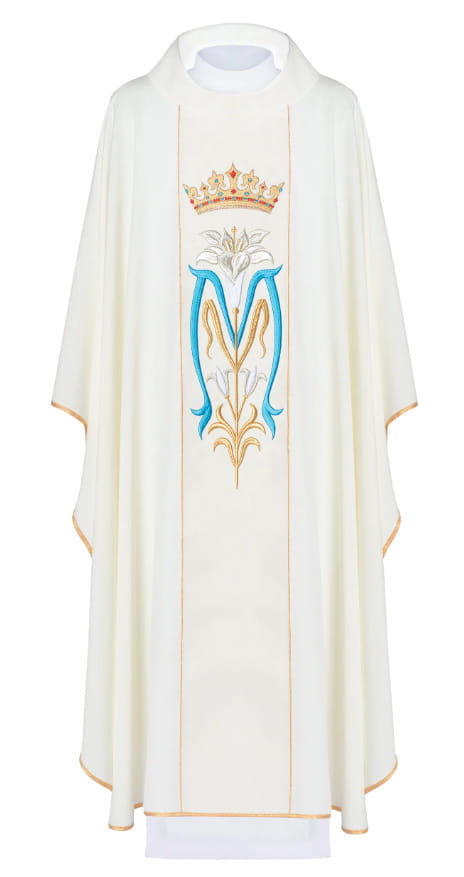 Ornat zdobiony dwustronnym haftem Maryjnym: M z koroną oraz lilią.