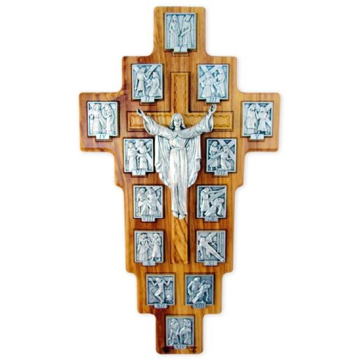 Stacje Drogi Krzyżowej wykonane w formie płaskorzeźby z metalu.