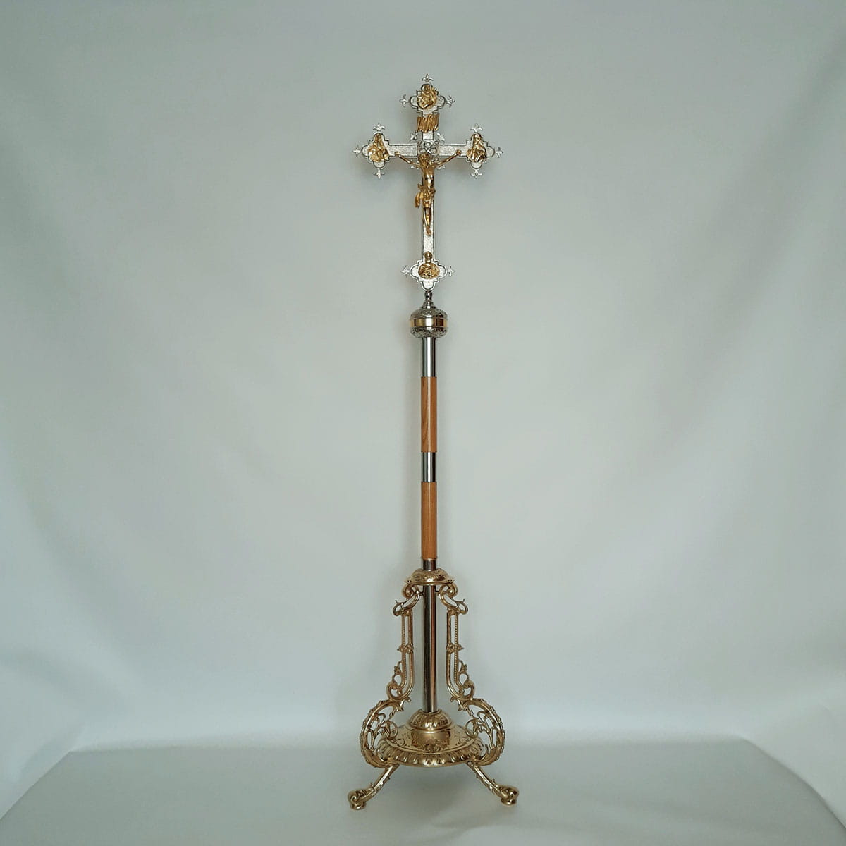 Wysokiej jakości produkt polski. Krzyż ołtarzowy procesyjny z podstawą. Niklowany z elementami pozłacanymi 24 karatowym złotem. Wyrób wykonany z rur mosiężnych; drewnianych elementów i odlewanych. W podstawie zamontowano plastikową tulejkę zapobiegającą uszkodzeniu krzyża podczas wyjmowania.