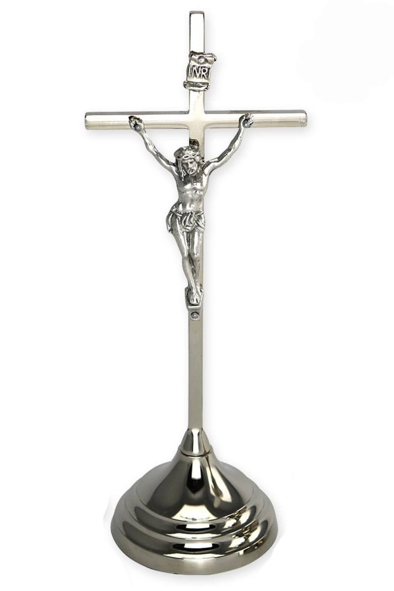 Krzyż prosty stojący w kolorze srebrnym.