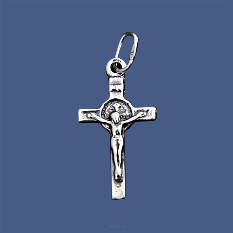 Krzyżyk z medalem świętego Benedykta. Starannie wykonany ze srebra krzyż o próbie srebra 925. Dopracowany w każdym szczególe, z uwzględnieniem najmniejszego detalu.