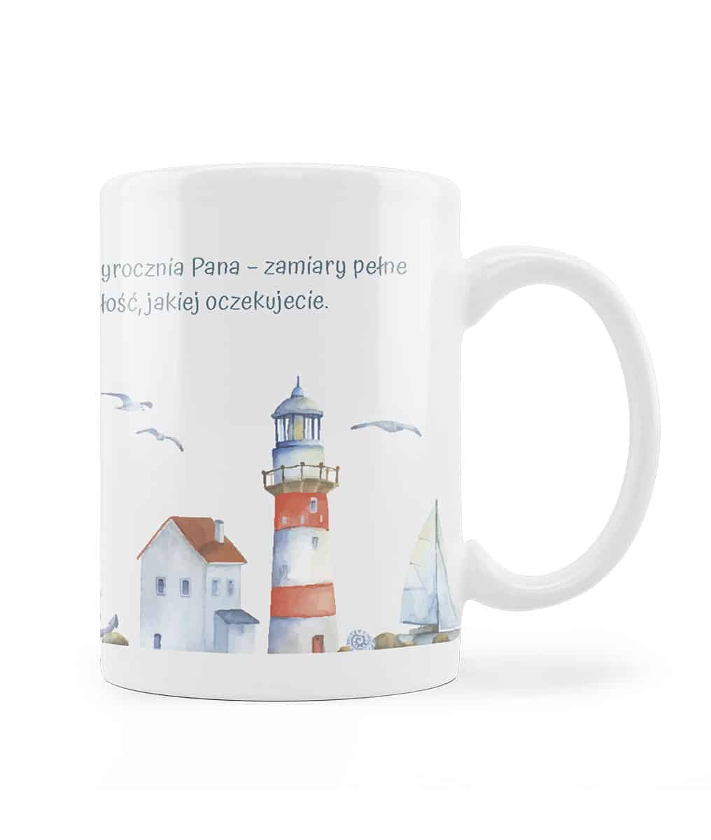 Kubek ceramiczny z wersetem lub tekstem opartym o wartości chrześcijańskie.