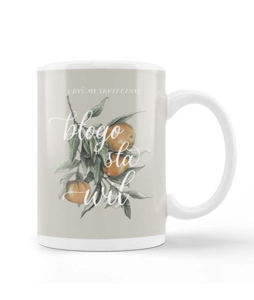 Kubek ceramiczny z wersetem lub tekstem opartym o wartości chrześcijańskie.