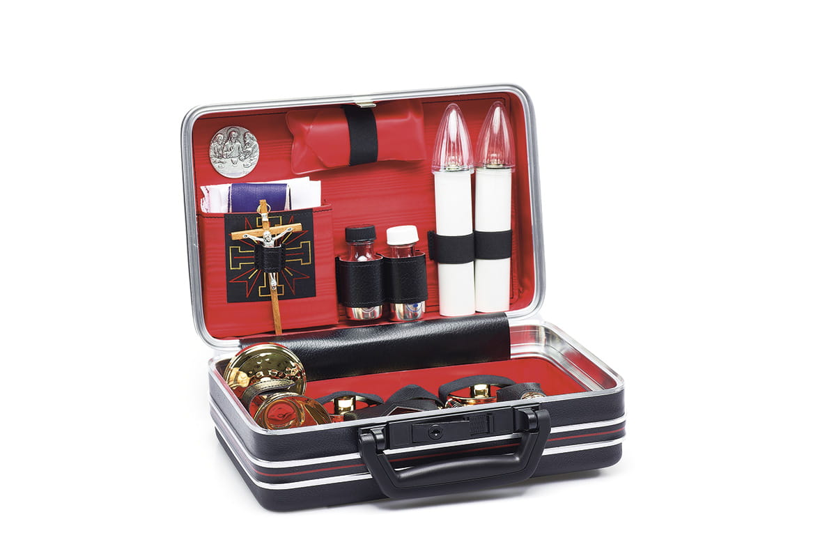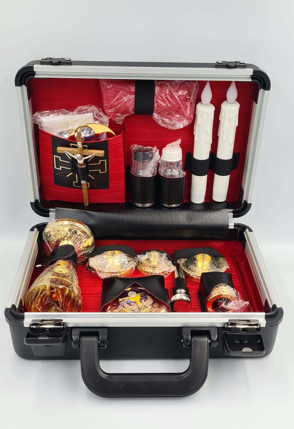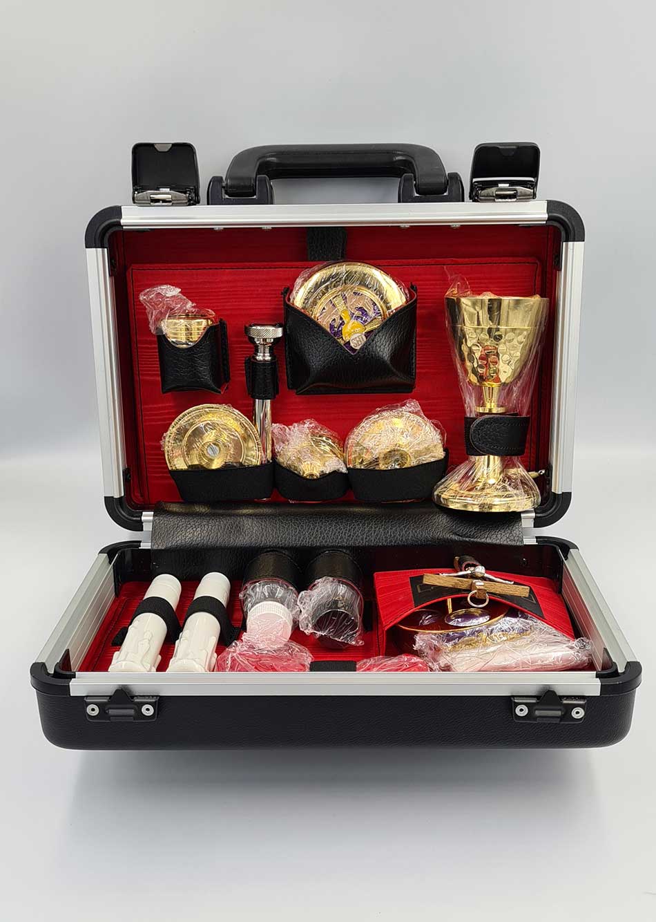 Liturgiczny komplet podróżny. Wymiary: 20 x 15 x 8 Skład min.: - walizka ze skóry naturalnej - świece - krzyż - kielich - stuła (biało-fioletowa) - butelka na wino i wode - patena - puryfikaterz