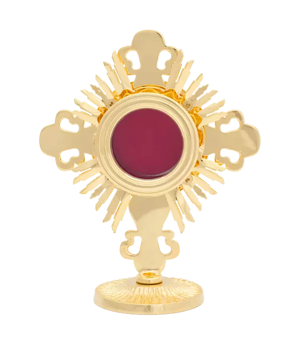 Relikwiarz wykonany jest z mosiądzu, złocony. Średnica kapsuły 37mm.