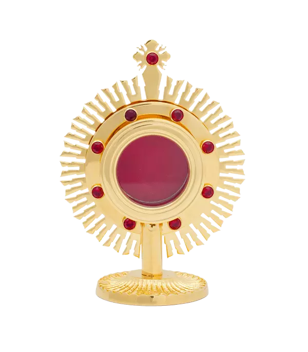 Relikwiarz zdobiony rubinami. Średnica kapsuły 37 mm.