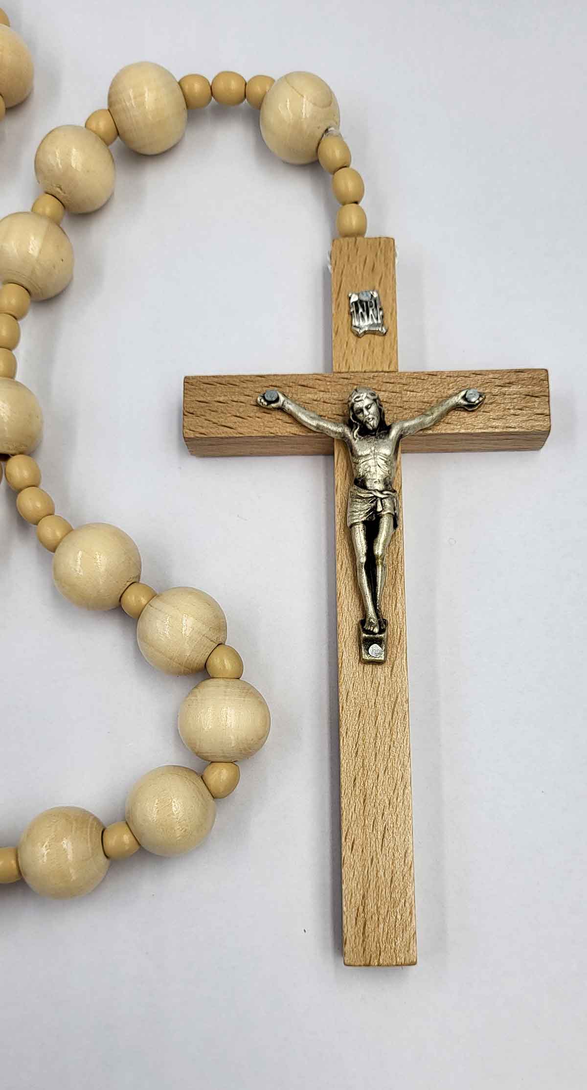 - kolor jasny długość całkowita 108 cm; paciorki różańca ok. 2 cm; krzyżyk 16 x 8,5 cm